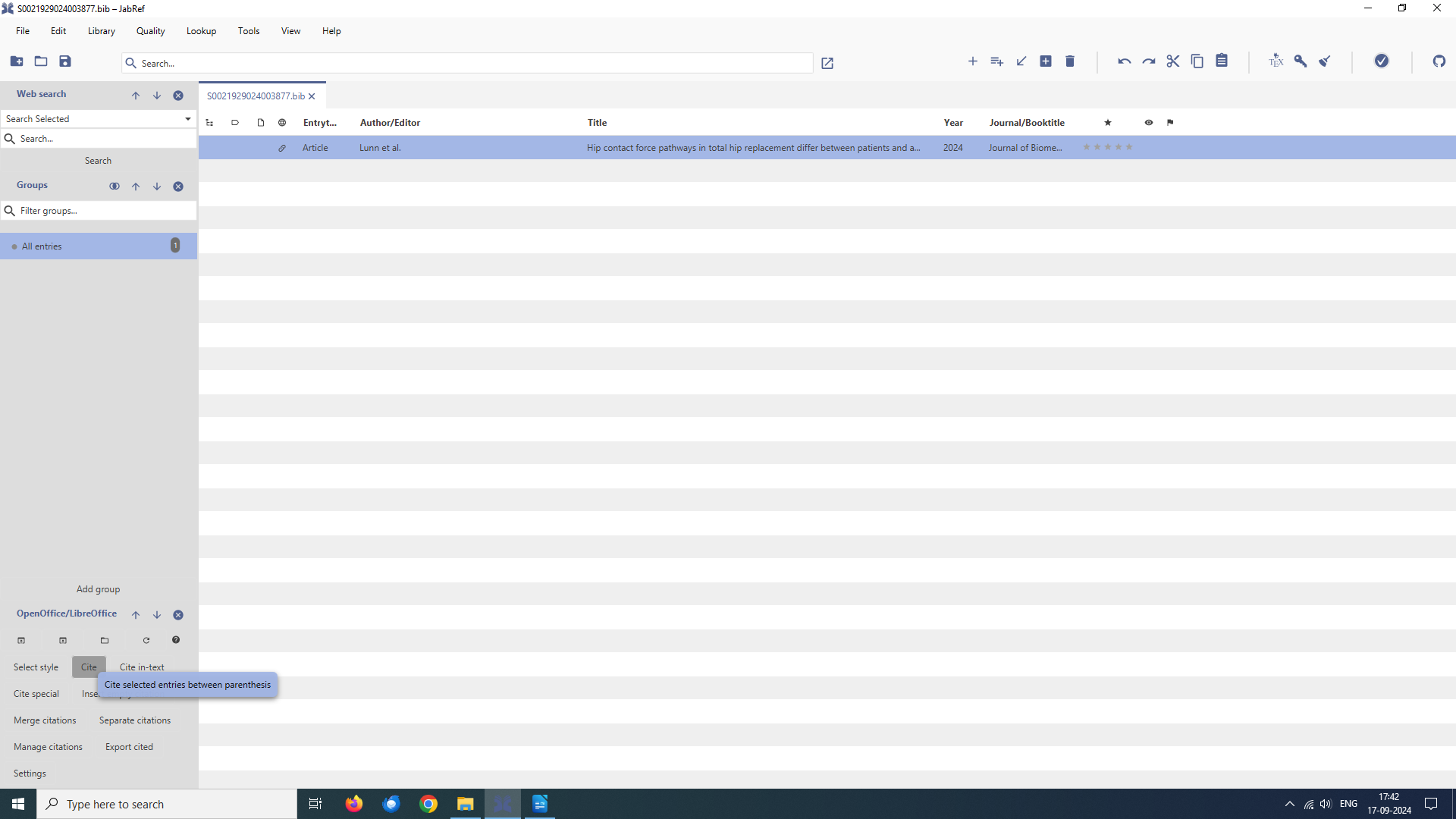 Once your document is connected with JabRef library take your cursor to the place on the document where you want citation to appear. Comeback to JabRef and select the reference you want and click Cite ​[1]. Depending on the chosen style it will insert the citation. Here, it has inserted a number within a square bracket.