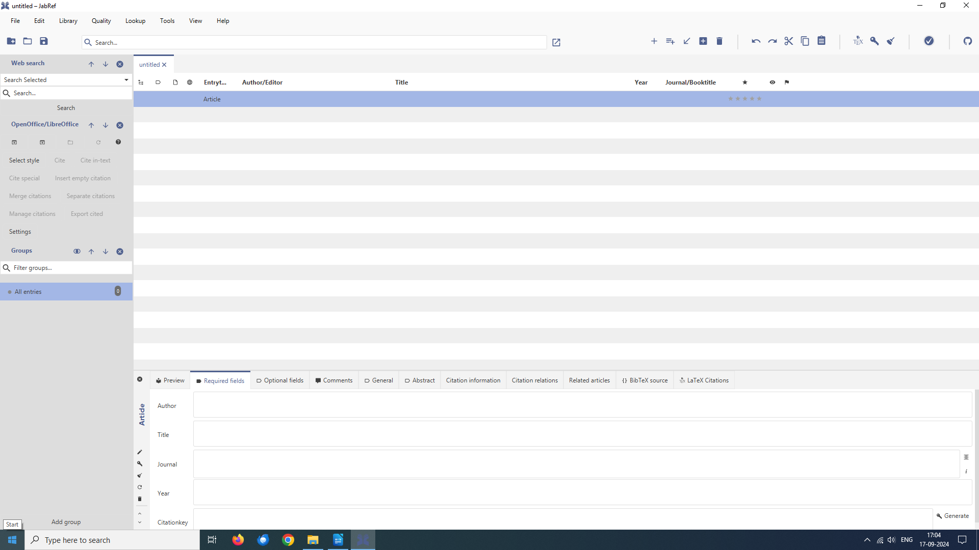 Click on the Article which will open a form with tabs to enter all the relevant information required for an article reference type. Go through each tab and the enter information. At the end create the citation key. Save the new library and give it a name when prompted.